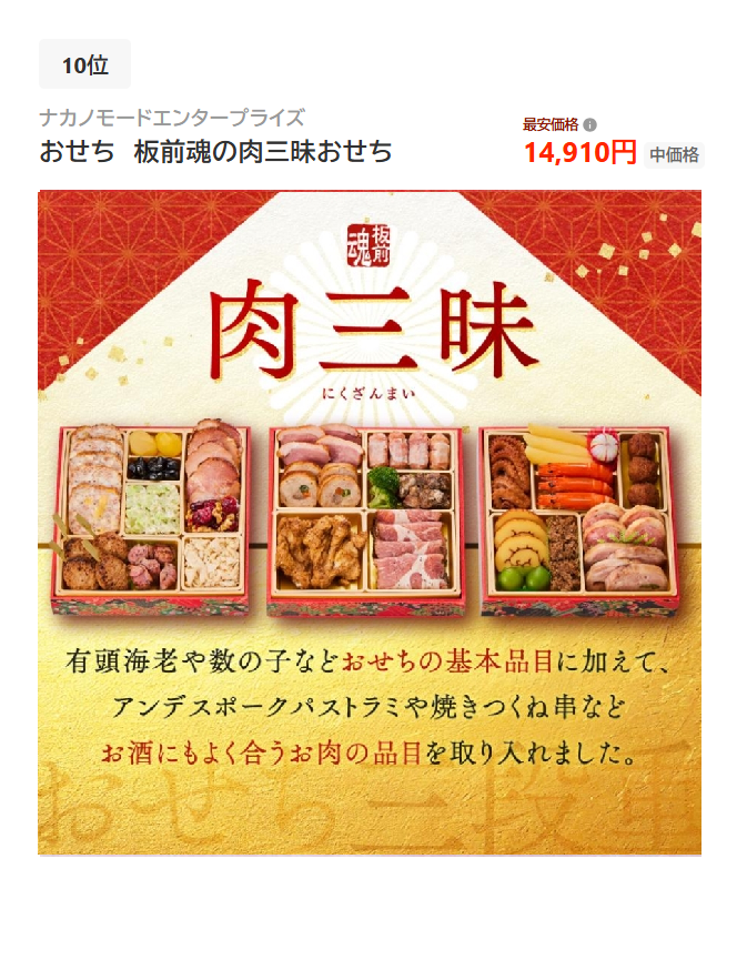 10位ナカノモードエンタープライズおせち 板前魂の肉三昧おせち肉特化14,910円〜3人冷凍