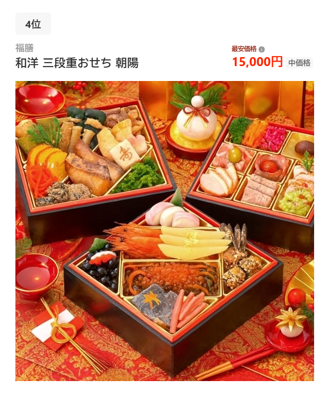 4位福膳和洋 三段重おせち 朝陽和洋折衷15,000円〜2〜3人冷凍