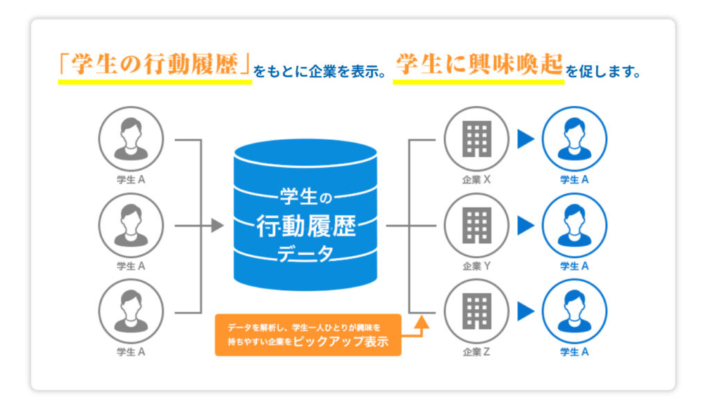 プロフィールを詳細に記入している意欲の高い学生に対し、一通ずつ丁寧にスカウトを送ることで、ミスマッチを最小限に抑えます。2026年、ナビサイトでの埋没を避けたい中堅・中小企業や、特定のスキルを持つ学生を一本釣りしたい企業にとって、非常に有効なツールとなっています。