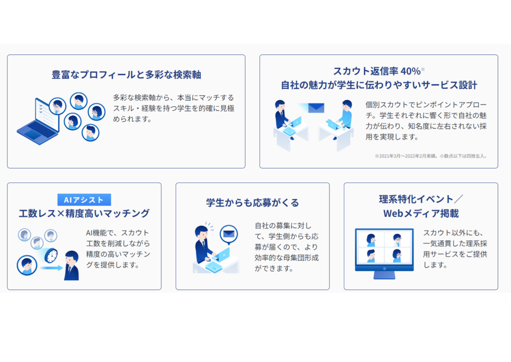 一般的なナビサイトでは見えにくい「研究内容」や「スキル」で学生を検索できるのが最大のメリットです。エンジニア、研究職、開発職など、専門性の高い人材を確保したい企業にとって、ターゲットが最初から絞られているこのツールは非常に効率的。2026年の技術革新競争において、欠かせないプラットフォームです。